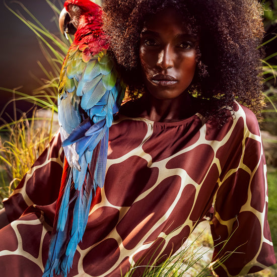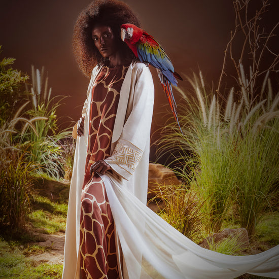 This luxury abaya was inspired by a sunrise Ulusaba game-drive through the Sabi Sands in South Africa - where giraffes stretched into silence and golden dust carried the morning light.